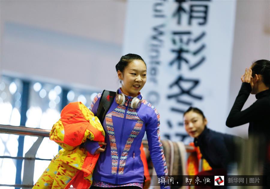 1月25日,乌鲁木齐代表队花样滑冰选手余婷慧(前)结束赛前训练离开冰场。