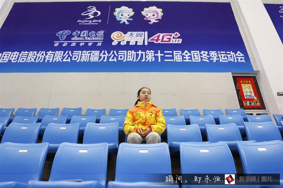 1月25日,余婷慧在观众席上观看其他运动员的赛前训练。新华社记者张晨摄