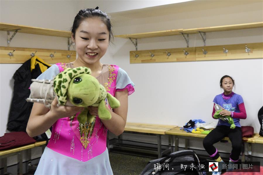 1月25日,训练结束后余婷慧(左)将冰刀装入“玩偶”套内。新华社记者王菲摄