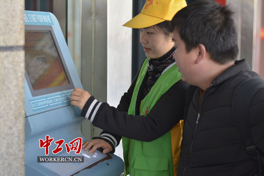 潘荷颖担当志愿者教旅客在自动取票机上取票。