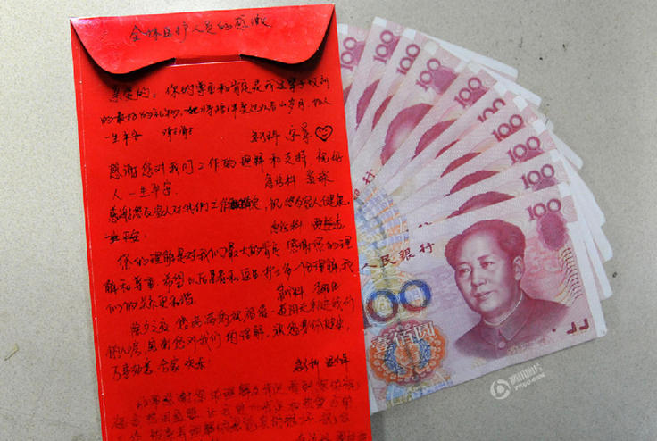 从护士口中得知当晚有10名医护人员值班后,刘女士就左手打着点滴,右手写祝福语,并在每个红包里塞进1张百元钞票。打完点滴,她趁没人注意,将红包塞进离门口最近的收药窗口。图为护士给患者的“祝福红包”上写满祝福话语。