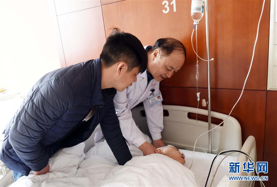手术结束后,程欣被送回病房,田增民教授(右)和程欣的父亲在试着和程欣交流。