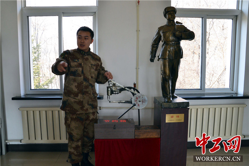 “雷锋班”现第25任班长毕万昌向志愿者们介绍了“雷锋班”的历史与传承,以及新时期“雷锋班”战士通过学习创新,利用新科技手段广播“雷锋精神种子”的事例。例如在雷锋班“老三件宝”(修鞋机、理发箱、节约箱)基础上,增设“新三件宝”(雷锋班微博、善淘箱、数字化大礼包)。目前雷锋班微博单贴浏览量最高达35万人次,善淘箱募捐衣物10000余件,数字化大礼包得到参观群众广泛好评。摄影:秦笑语