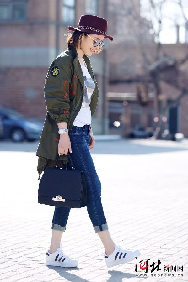 日前,知名女星车永莉曝光一组最新街拍照片。照片中的她自在潇洒,基础单品的搭配显得利落大方又不失时尚感。她身着军绿色外套搭配窄腿牛仔裤,酷劲十足,卷起来的裤边更是显得整个人修长又时尚,枣红色小礼帽的点缀也是恰到好处。