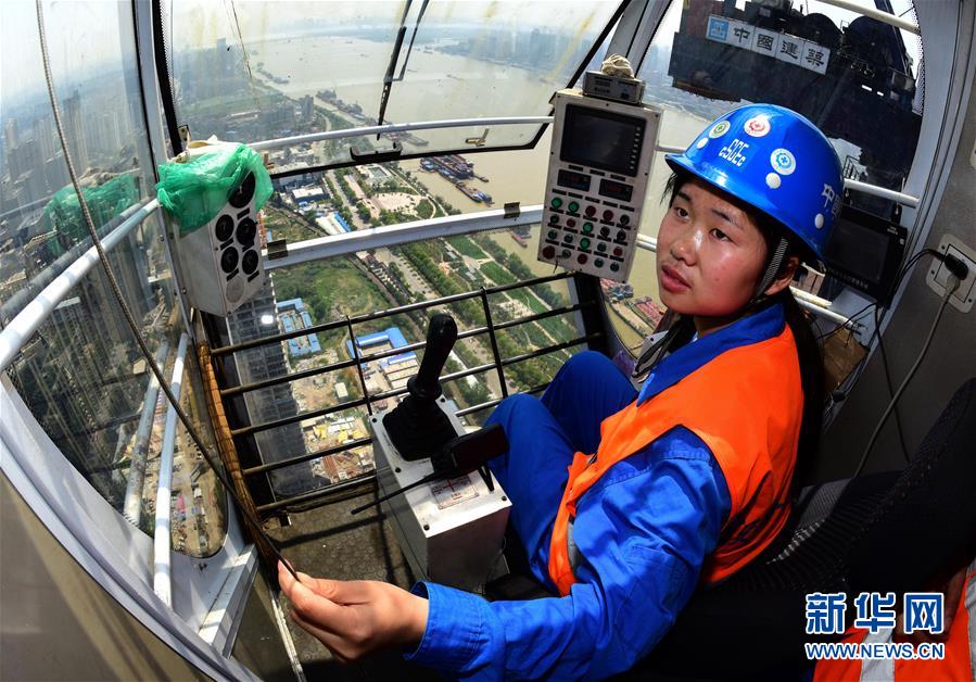 4月28日,肖金花在工地上操作塔吊。在武汉绿地中心的建设工地上,有一对来自湖北省麻城市的表姐妹,她们在数百米的高空,操纵着亚洲房建领域最大的动臂塔吊。她们就是中建三局二公司年轻的塔吊操作工卢有珍和肖金花。卢有珍、肖金花姐妹俩都出生于1989年,还不到30岁,却已经操作塔吊3年多了。在设计高度636米的武汉绿地中心开工后,姐妹俩被派到这里,共同负责一台动臂塔吊的操作,互相轮班。随着大楼一天天“长高”,姐妹俩工作的“海拔”也一天比一天高,目前已离地300多米了,可谓身处“云端”开塔吊。长期从事高空作业,不仅要有很强的心理素质,还要克服长时间一个人在“云端”的寂寞,以及风吹日晒的考验。但姐妹俩说:“能见证和参与这座城市一步一步的变化,是我们的幸运。” 新华社记者 程敏 摄