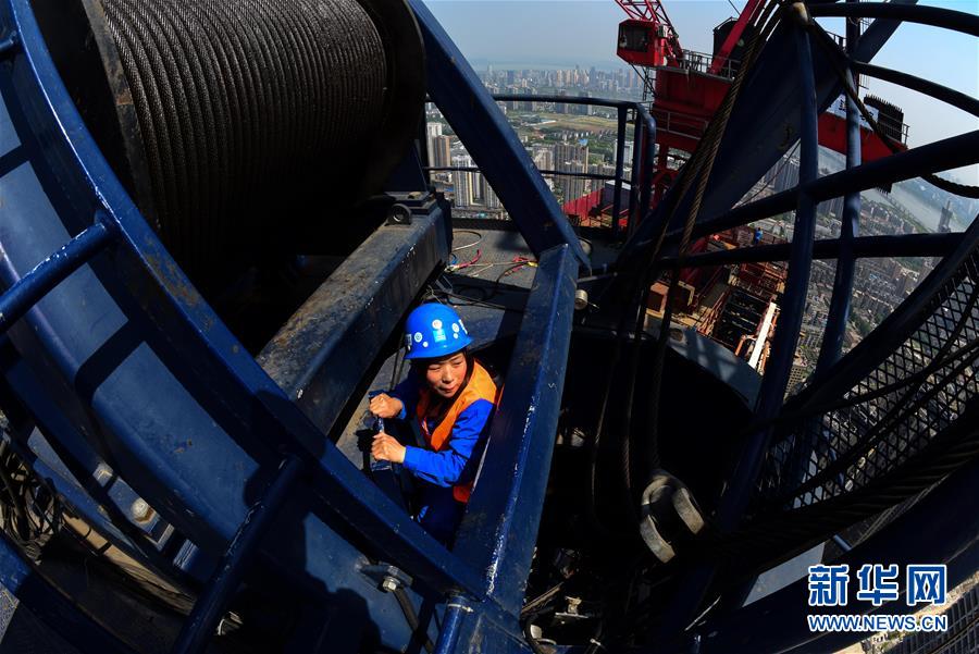 4月28日,卢有珍爬上操作平台,准备与表姐交接班。在武汉绿地中心的建设工地上,有一对来自湖北省麻城市的表姐妹,她们在数百米的高空,操纵着亚洲房建领域最大的动臂塔吊。她们就是中建三局二公司年轻的塔吊操作工卢有珍和肖金花。卢有珍、肖金花姐妹俩都出生于1989年,还不到30岁,却已经操作塔吊3年多了。在设计高度636米的武汉绿地中心开工后,姐妹俩被派到这里,共同负责一台动臂塔吊的操作,互相轮班。随着大楼一天天“长高”,姐妹俩工作的“海拔”也一天比一天高,目前已离地300多米了,可谓身处“云端”开塔吊。长期从事高空作业,不仅要有很强的心理素质,还要克服长时间一个人在“云端”的寂寞,以及风吹日晒的考验。但姐妹俩说:“能见证和参与这座城市一步一步的变化,是我们的幸运。” 新华社记者 程敏 摄