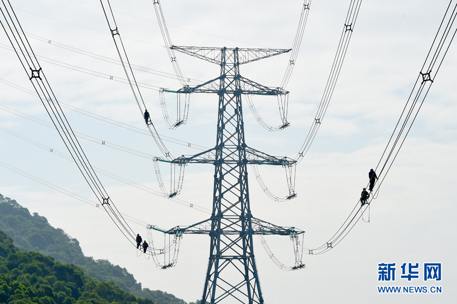 500千伏国安至加林线路工程是广东电网的重点工程,线路全长约30公里,新建塔75基。加国线跨越珠海大桥、西江航道、西部沿海高速等特殊施工地段。这些地段地形地貌情况较为复杂、施工程序要求严格、技术难度较高,对放线施工造成了一定的困难。面对各种难题,珠海供电局和施工方积极协调解决各方难题,克服重重困难,终于迎来了工程的验收阶段。图为无人机航拍的珠海供电局巡线工走线验收组图。新华网发 莫默 摄