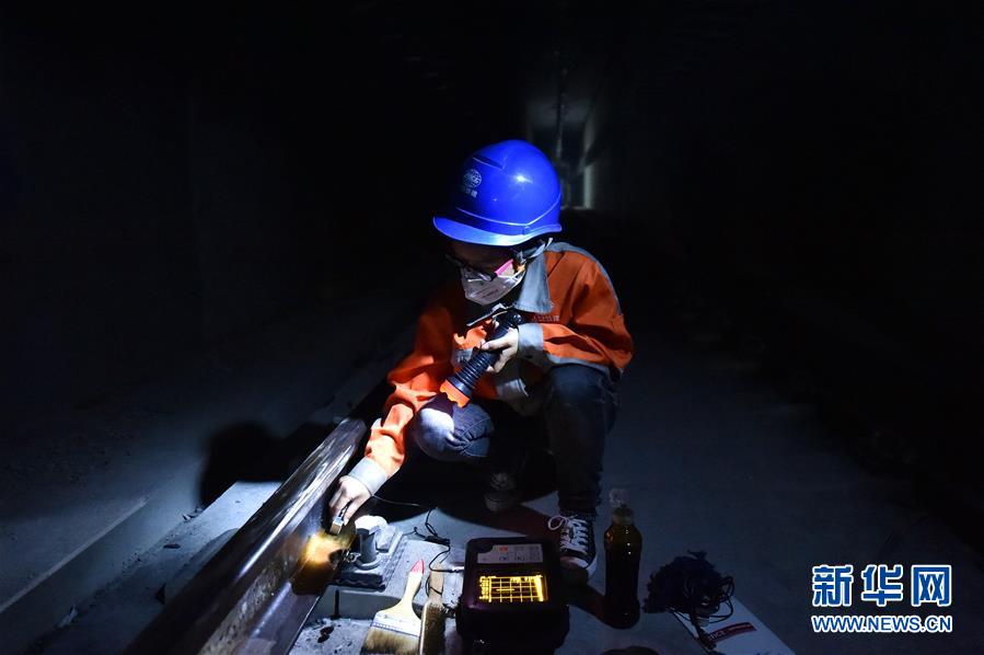 关改玉在为石家庄地铁的一段铁轨探伤(5月3日摄)。