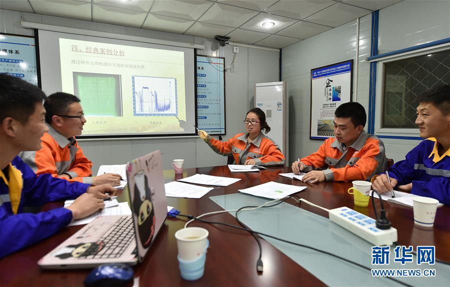 关改玉(右三)在和同事们做探伤工作课题研究(5月3日摄)。新华社发(曹阳)