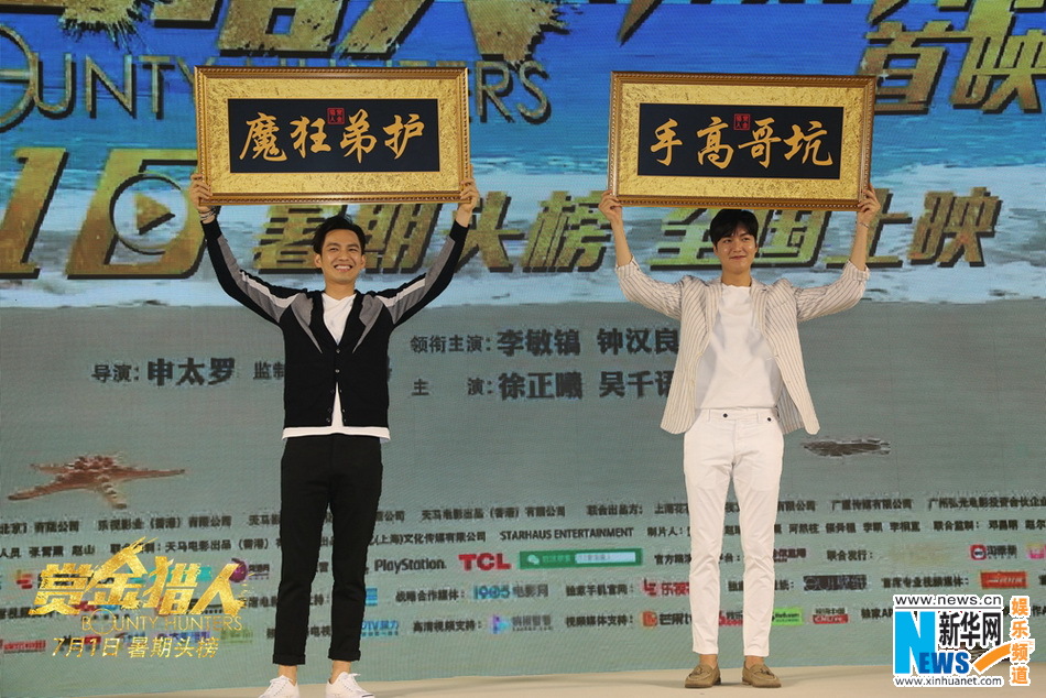 发布会现场,知名音乐人陈羽凡携电影推广曲——清新版《奔跑》热力开场,并宣誓加盟赏金天团,获得“歌坛猎金死党”称号。李敏镐和钟汉良自称是“坑哥能手”和“护弟狂魔”,并互赠金字牌匾。两位光芒耀眼的男神,现场接到BOSS的指令要到海边出任务。两人经过一番乔装打扮后,滑板、花环、墨镜、帽子加身、秒变逗逼,完全隐藏自己帅气猎人的身份。双男神默契配合、亲密无间,女神唐嫣也不甘示弱,自爆在戏里与两位男神的关系不一般,并且能把二人收拾的服服帖帖,是赏金猎人中的“女王”。现场,在导演申太罗的带领下,“猎金死党”一起为女王唐嫣举行加冕仪式,献上皇冠、权杖、绶带,非常热闹。现场,导演还对钟汉良和李敏镐不吝夸赞,称他们都是非常敬业的演员,能接受各种挑战、潜力巨大。