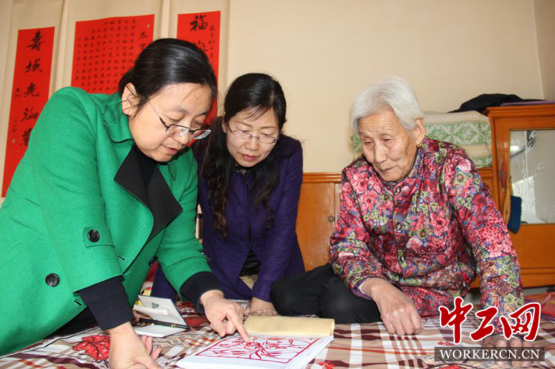 甘肃平凉市剪纸大师何霞观看吕桂珍老人的最新剪纸作品。