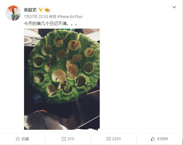 张歆艺微博晒莲蓬 网友:这个秀恩爱姿势给满分