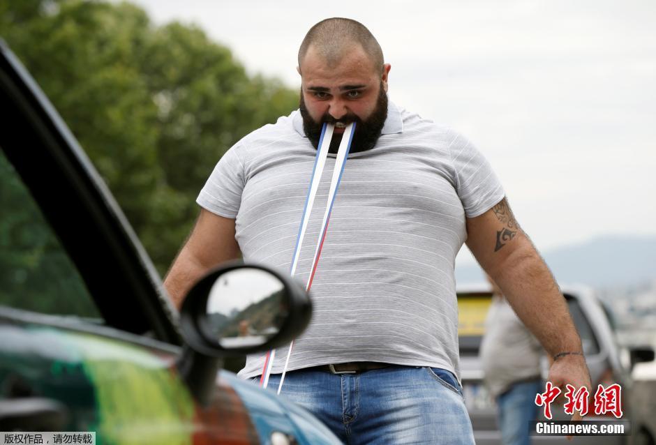 格鲁吉亚“力王”用牙齿拖动4辆轿车创纪录(高清组图)