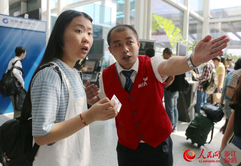 施杭东今年37岁,是机场志愿者队伍中的一员。施杭东说,G20是让全世界感知杭州魅力的重要窗口,自己作为接待旅客的第一站,一定要服务热情周到,让旅客对杭州留下美好的第一印象。对他来说,每一位来杭的旅客都是最重要的嘉宾。