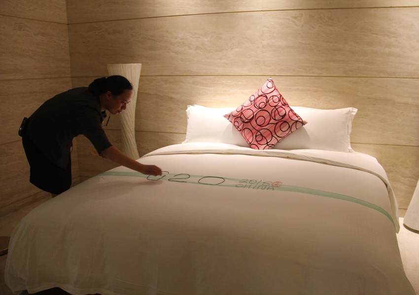 为让宾客留下美好的G20回忆,酒店员工们自己想出了不少招。比如,整理好床单后,用红黑蓝绿4色的缝纫线制成了一个G20杭州峰会LOGO,完全靠手工摆放成型。