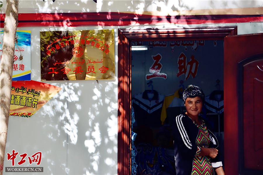 8月25日,一名少数民族妇女倚在五月旭梅服装车间门口。为积极推进农民工入会集中行动,伊宁县总工会帮助谷旭梅成立了公司工会委员会。(秦笑语 摄)