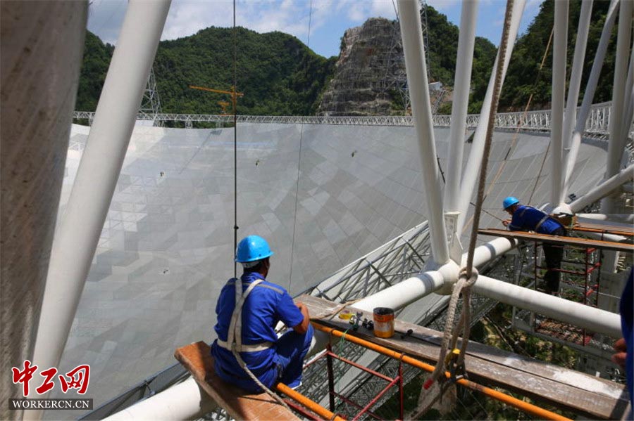 编者:500米口径球面射电望远镜(“天眼”)落成启用,离不开所有科学家和建设者的智慧、辛勤和汗水。在群山环绕的贵州黔南州平塘县“大窝凼”,地势险峻、山崖陡峭,坡度都在70度以上,根本没有可操作的施工作业面,低头,是悬崖;抬头,是峭壁。就在这样的环境中,建设者们学会了“飞檐走壁”,承受着雨淋日晒、风餐露宿,最终建成了具有我国自主知识产权、世界最大单口径、最灵敏的射电望远镜。这是所有劳动者汗水的结晶。今天我们刊发一组关于中建二局中国科学院国家天文台项目部工人的劳动场景照片,对“天眼”建成的艰辛和不易可见一斑。