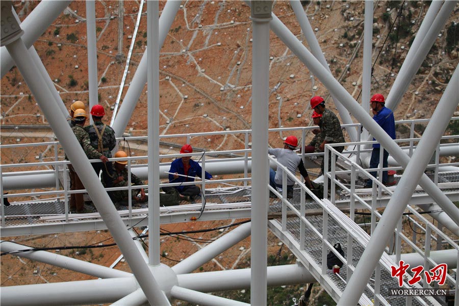 编者:500米口径球面射电望远镜(“天眼”)落成启用,离不开所有科学家和建设者的智慧、辛勤和汗水。在群山环绕的贵州黔南州平塘县“大窝凼”,地势险峻、山崖陡峭,坡度都在70度以上,根本没有可操作的施工作业面,低头,是悬崖;抬头,是峭壁。就在这样的环境中,建设者们学会了“飞檐走壁”,承受着雨淋日晒、风餐露宿,最终建成了具有我国自主知识产权、世界最大单口径、最灵敏的射电望远镜。这是所有劳动者汗水的结晶。今天我们刊发一组关于中建二局中国科学院国家天文台项目部工人的劳动场景照片,对“天眼”建成的艰辛和不易可见一斑。