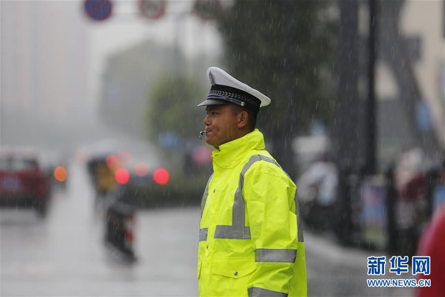 10月2日,在江苏省连云港市赣榆区黄海路,一名交警在雨中执勤。国庆长假期间,许多劳动者坚守在工作一线,在本职岗位上度过假期。新华社发(司伟 摄)