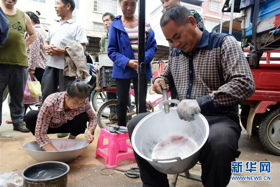 10月2日,在广西全州县文桥镇,一名做铸锅的男子(右)在给顾客打磨刚刚铸好的铝锅。国庆长假期间,不少劳动者依然坚守岗位,默默奉献。新华社记者 陆波岸 摄