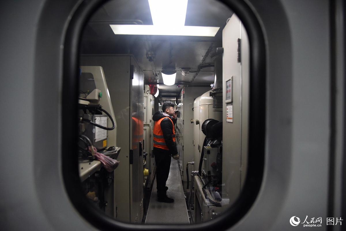2017年2月3日,司机赵力强对火车头机械间进行巡检。