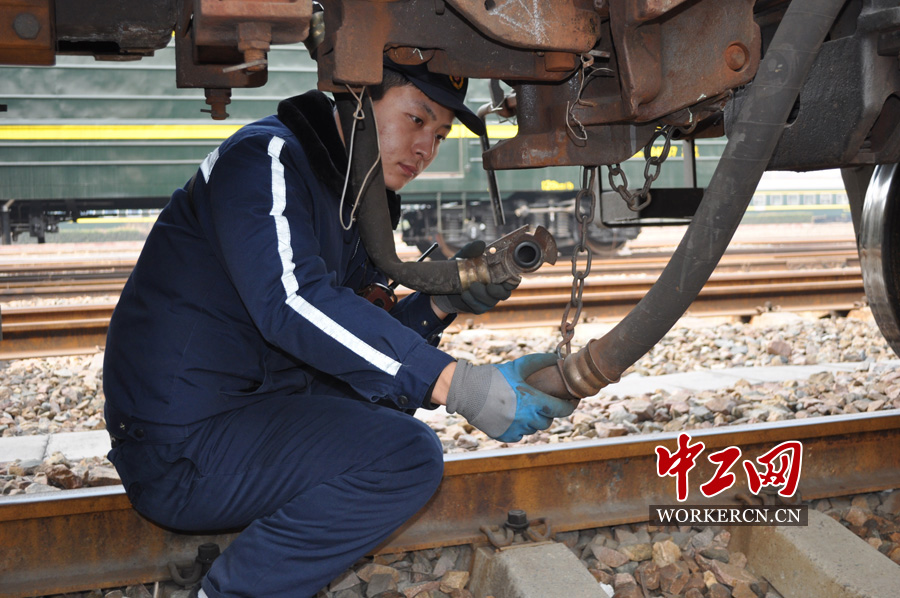 行走在股道,他为送车取车检查线路;往来在站台,他观察车辆检查车况;扒上跳下,他用肉眼测距联控调速;蹲下站起,他撤除防溜查看软管摘解状态。