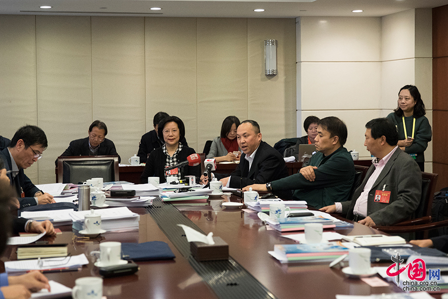 3月8日,北京市京西宾馆,全国人大代表周振波在上海团小组讨论中为保障农民工群体权益呼吁。中国网记者 董宁摄影