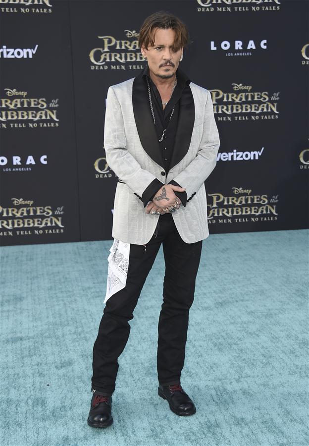 5月18日,在美国洛杉矶,演员约翰尼·德普参加影片《加勒比海盗5:死无对证》的首映式。《加勒比海盗5:死无对证》将于5月26日在美国上映。 新华社/美联