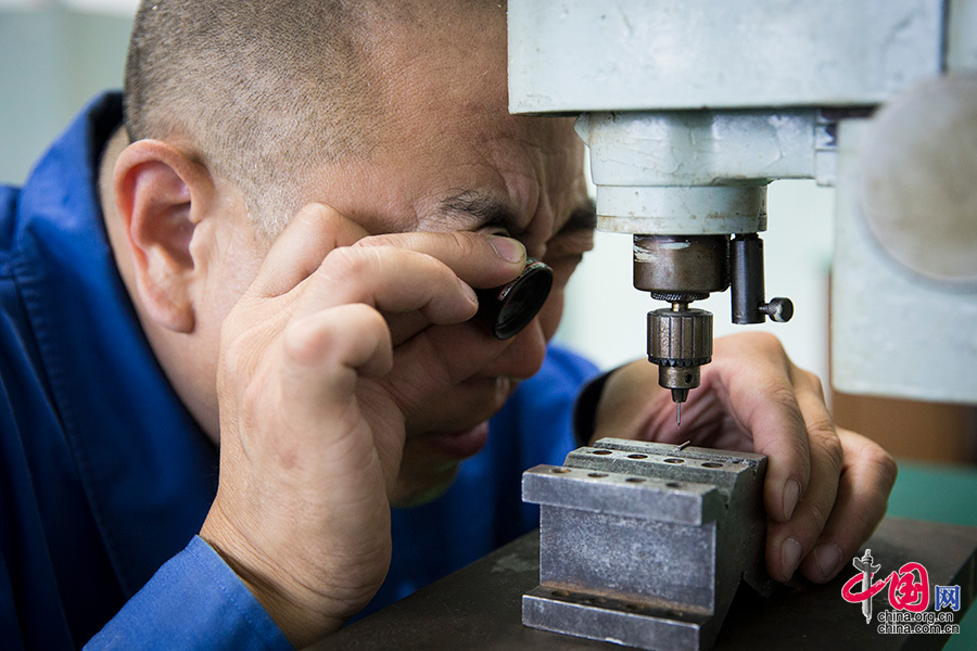 贾岩在一根直径2mm的不锈钢管壁上加工一个直径0.17mm的小孔,这项工作对人手的稳定性、眼的观察力和心理素质都是严峻的考验。中国网 董宁摄影
