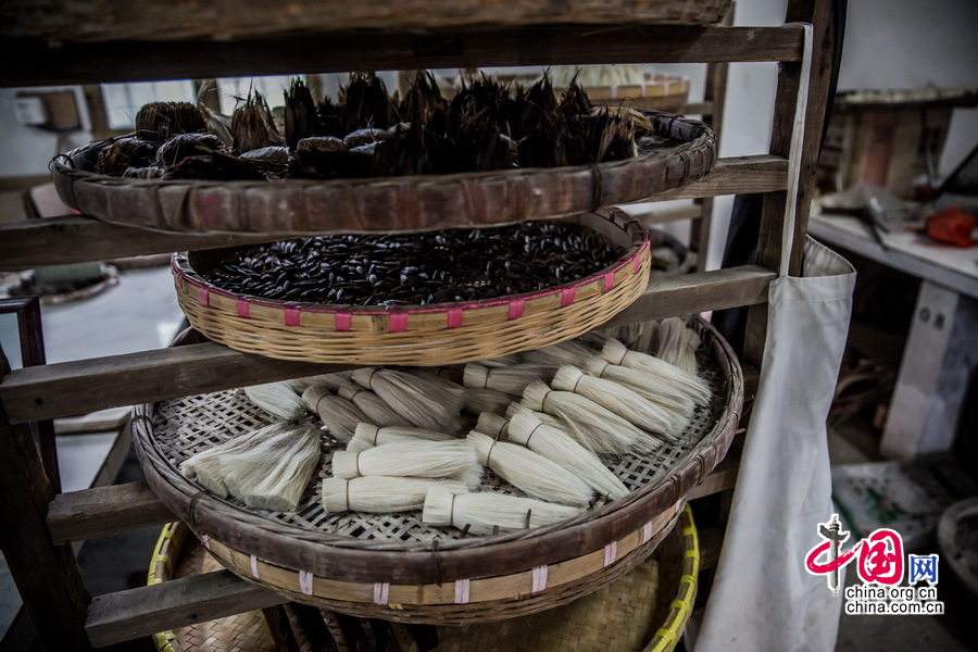 制作宣笔主要用三种毛:羊毛的叫做羊毫笔,黄鼠狼尾毛的叫狼毫笔,用兔毛做出来的叫紫毫笔。佘征军总是说,一支毛笔最重要的就是笔头,只有制作出好的笔头,才能做出真正优秀的毛笔,如果笔头做的不好,那做出来的就不叫毛笔而是刷油漆的刷子。佘征军厂里制作的毛笔在生产笔头时一直坚持纯手工制作。中国网记者 郑亮摄