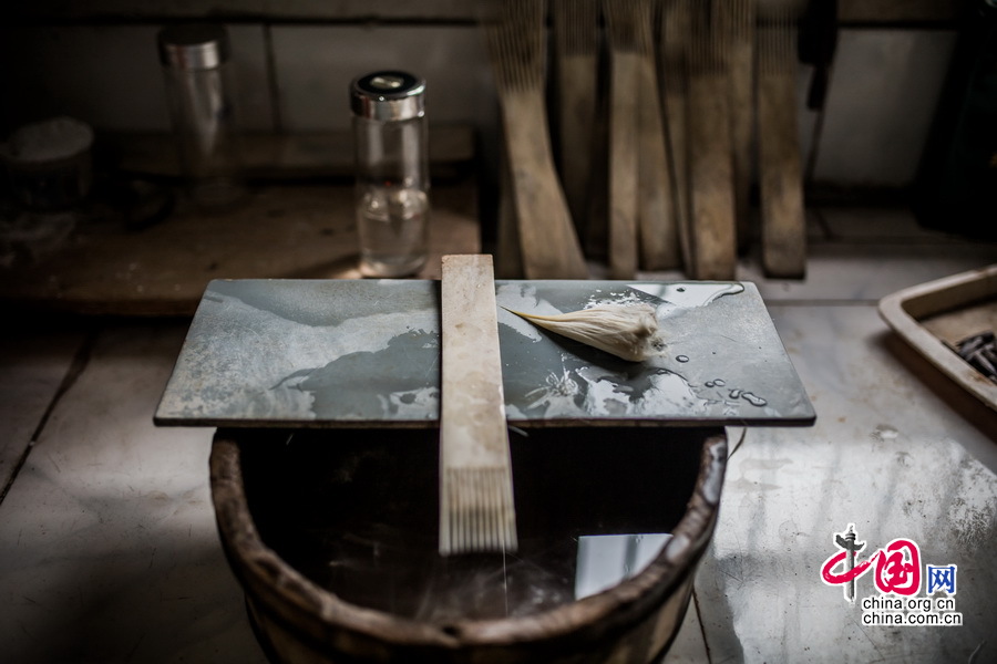 制作笔头是生产一支毛笔耗时最久的部分之一,离不开制笔师傅耐心仔细的重复工作,仅仅洗笔头这道工序就需要半个小时左右的时间。中国网记者 郑亮摄