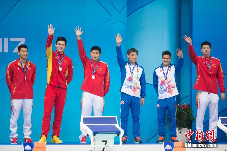 9月1日,天津全运会举行男子4x100米自由泳接力比赛,孙杨领衔的浙港联队最终不敌广东名将余贺新领衔的广东河南辽宁联队,屈居亚军。图为徐嘉余(左一)、孙杨(左二)及教练、香港选手杜敬谦(右二)及教练、汪顺(右一)组成的浙港联队登台领奖。中新社记者 李卿 摄