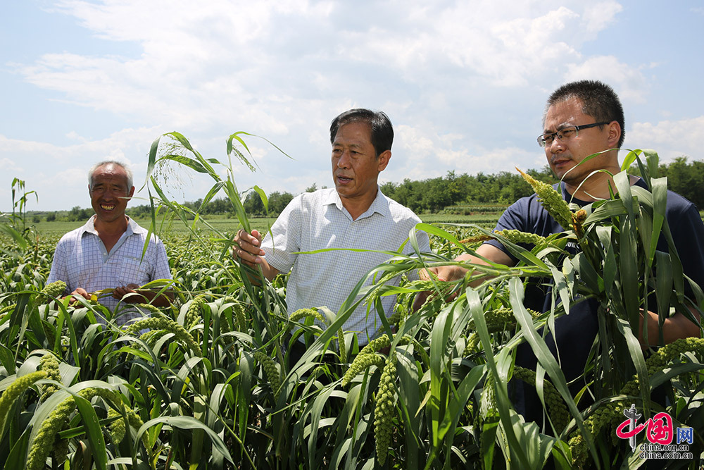 8月是谷子出穗的关键节点,山西沁州黄小米集团董事长石耀武在册村镇西北村田间地头检查谷子生长情况,这事关企业来年新谷的收购,更关乎15000多户农民一年的收入。西北村海拔不足1100米,地势相对较低,通风不足和前期预防不到位导致村民郝国荣(左)田里的部分谷子出现纹枯病症状,石耀武(中)了解病症,责成公司的基地部负责人宣达龙(右)尽快确诊并确立解决方案。中国网记者 董宁 摄