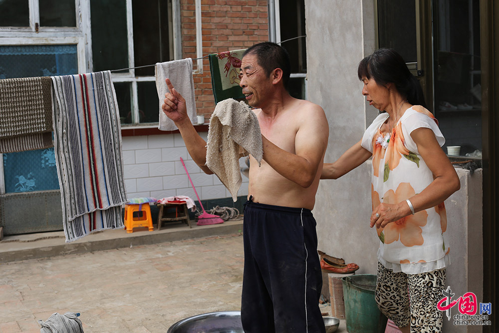8月10日下午,郝军帮助李彩萍的房梁重新做了清理,消除了房子坍塌的隐患,李彩萍为他擦背。李彩萍的丈夫三年前因车祸去世,膝下一双儿女均已成家在外,李彩萍说,村里粗活重活多,一个单身妇女操持起来总是力不从心,晚上经常独自抹眼泪。结识郝军后,日子才活的又有了生气,她非常感谢沁州黄集团,因为在农村,人群分布分散,很多像他这样的单身村民有需求,却苦于信息闭塞,没有平台。沁州黄小米集团董事长石耀武说,这种相亲会以后会坚持每年举办,精神扶贫同样不可忽视。中国网记者 董宁 摄