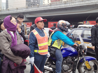 陈益华就是其中一位交通协管员,10月9日14点,寒风乍起,雾霾笼罩,她戴着红帽,吹着口哨、挥动小旗在两个路口之间穿梭,长期风吹日晒,让她的脸看上去明显黝黑。“往后站,往后站,注意安全……”总有一些心急的行人踏上斑马线,探出脖子观察车流,伺机穿过马路,陈益华要不时上前把人拉回来。