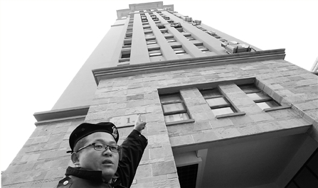 李迎福当时就在楼下保安亭,他一边大声劝慰楼上女子,一边让围观居民散开。