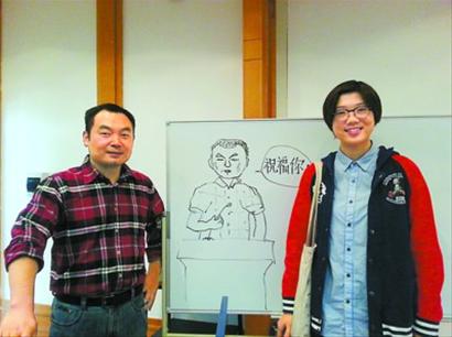 “一分钟自我展示”环节,美术学院大二学生庄雪凡给李晨(左)画了张漫画。