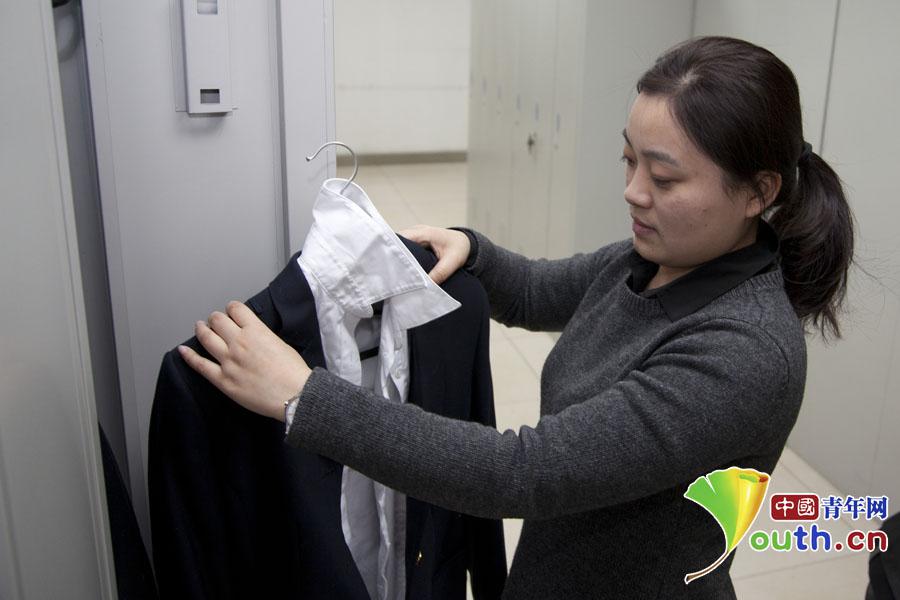 韩军现在是客服大厅一组的组长,她在去年被单位评上了委屈奖。图为韩军正准备更换工作服开始工作。