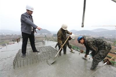 卿德文(左一)在高架桥上指导工人施工(通讯员 郭国权/摄)