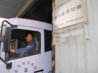 8:35曹满屯驾车来到了位于西城区珠市口西大街南侧的留学路清洁站。曹满屯麻利地摘下安全链,熟练地倒入清洁站,卸空箱、装重箱,在西城区环卫服务中心留学路清洁站谯治均师傅的配合下,仅仅用了10分钟,就完成了卸箱装箱的工作。挂上安全链,检查箱体顶部、后部是否有垃圾挂带,驶离了清洁站。