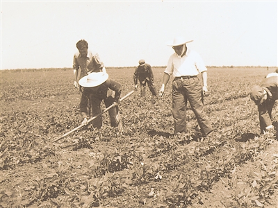 1980年,时任铁道兵第二政委的旷伏兆在铁道兵东北嫩江基地检查大豆生产情况。 作者提供