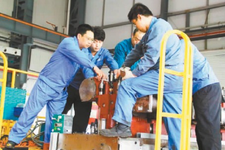 50多岁的彭永建(左一)长期在柴油机组装试验车间忙碌着。这位南车玉柴四川发动机公司的高级技师、技能专家,已经先后在南车资阳机车公司、南车玉柴公司的生产研发一线工作了30年。2009年获四川五一劳动奖章、2010年获四川省劳动模范殊荣,2013年3月,由中国南车集团评审设立的“彭永建技能专家工作室”正式授牌。 作为高级技师,彭永建在生产工作中摸索总结的“眼耳手工作法”,为柴油机组装调试和故障判断处理发挥极大作用。图为彭永建与工人们在柴油机组装现场。钟国志 摄