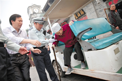 5月1日9时许,前门,前门大街城管分队长颜承林扶老人下车。老人因腿脚不便走不动路,向城管求助,颜承林用电瓶车将她送到车站。