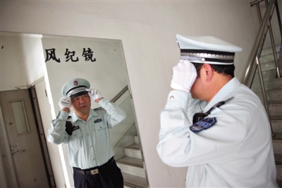 5月1日上午,颜承林出勤前在风纪镜前整装。