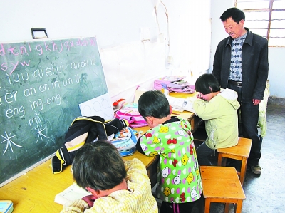 虽然只有一个人,拓守宾每天仍坚持规范的作息时间:上午8点到校,11点放学;下午1点上学,4点放学。每天保证6小时的教学时间。他家就在学校旁,只要学生来了,他就开始教课,所以,实际教课常常是从7点开始的。虽然学生少,但不是一个年级,各科头绪很多,他教起来并不轻松。