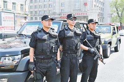 特警队员在哈站站前巡逻。(本报记者 马智博 李天池摄)