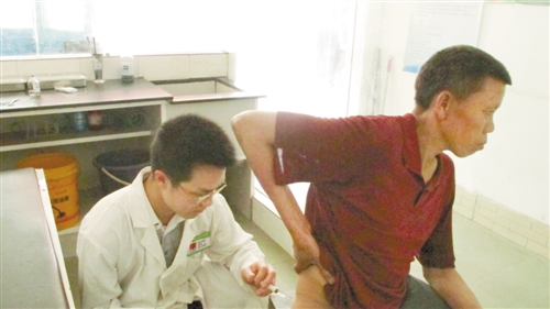 医生刘益彬用一串“怪异”的动作,完成了对他的臀部肌肉注射:他先是用弯曲的右手将药瓶压在胸口,然后用左手持注射器抽取药液,之后一瘸一拐地走到村民周裕章身后,半蹲下身子,又用弯曲的右手压住注射部位、用左手推进药液。