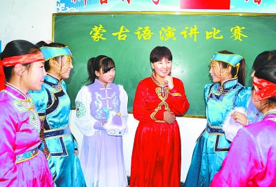 蒙古语演讲比赛中刘艳春(左四)与获奖选手交流。资料照片