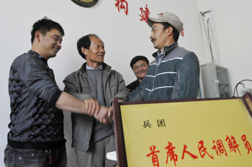 7月16日,张永进(中)在为农场职工张勇(左)和赛买提(右)进行纠纷调解。(本报记者 约提克尔·尼加提摄)