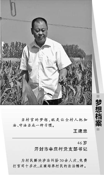 “农村的穷和乱,根子在愚昧、法治意识淡薄。”王建忠联想自己代理过的案件,一些简单的农村宅基地纠纷竟能演化成刑事案件。他认为,“必须有一个懂法、宣传法的明白人和带头人,农村法治才能变成现实。”2011年底,他回到家乡参加“两推一选”,成功当选辛庄村党支部书记。
